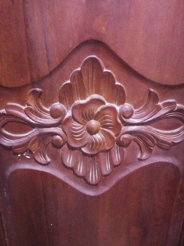 A close-up photograph displays a section of a dark reddish-brown wood panel with a central carved relief