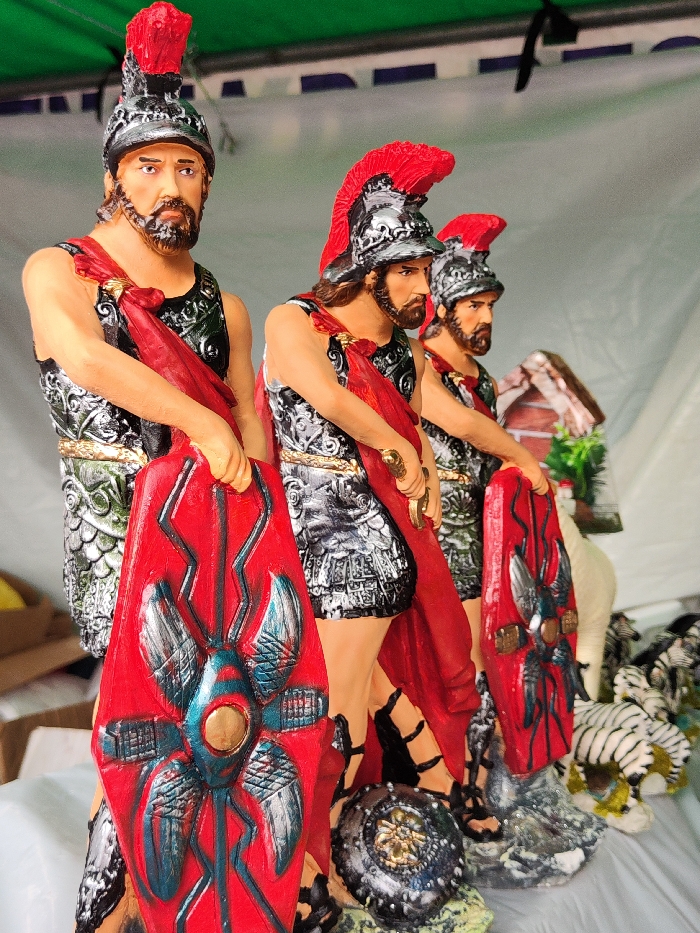 Three statues depict Roman soldiers in silver and black armor, red capes, and helmets with red crests
