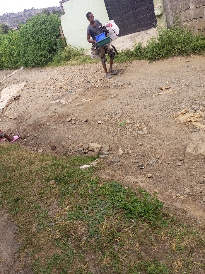 An outdoor scene in Kiamaina ward, Kenya, depicts a dusty, unpaved thoroughfare with scattered debris under natural daylight. In the center, a young male, appearing to be in his late teens or early twenties, with short dark hair, walks from left to right. He wears a dark t-shirt, light-colored distressed or ripped trousers, and light-colored closed-toe shoes. He carries a white cardboard box with red markings in his right arm, and two nested plastic basins (one blue, one green) in his left hand. A light-colored bag or cloth bundle is slung over his left shoulder. His gaze is directed slightly downwards and to his right. In the lower-left foreground, the lower leg and foot of another individual, wearing a pink open-toed sandal, are partially visible, obscured by a patch of grass. The ground surface is predominantly dirt and gravel, uneven, with exposed rocks and various pieces of refuse, including torn paper/fabric and small plastic items. Patches of green and dry grass grow along the lower edges of the frame and a defined line separates the grass from the dirt path. In the background, to the right of the central figure, stands a light-colored building with a large, dark-colored metal gate. Further right, a concrete wall is visible. To the left of the building, extensive green bushes and foliage cover a rising terrain. Beyond this, a distant hillside with sparse vegetation and faint structures is visible under an overcast sky.