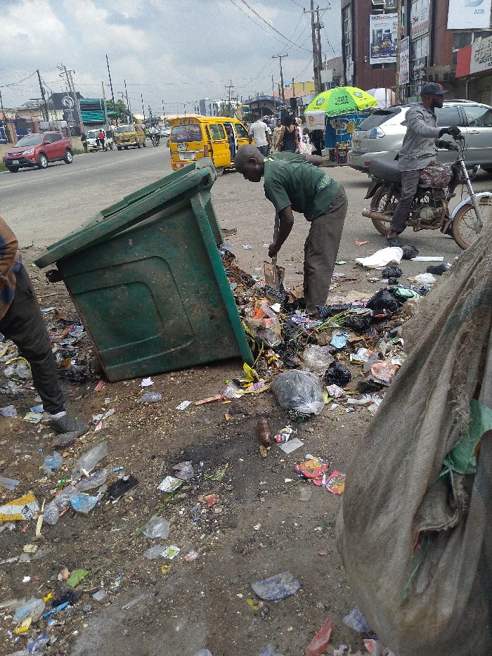 The scene depicts a street-level view on an overcast day, capturing a significant accumulation of refuse on the side of a commercial street in Lagos, Nigeria