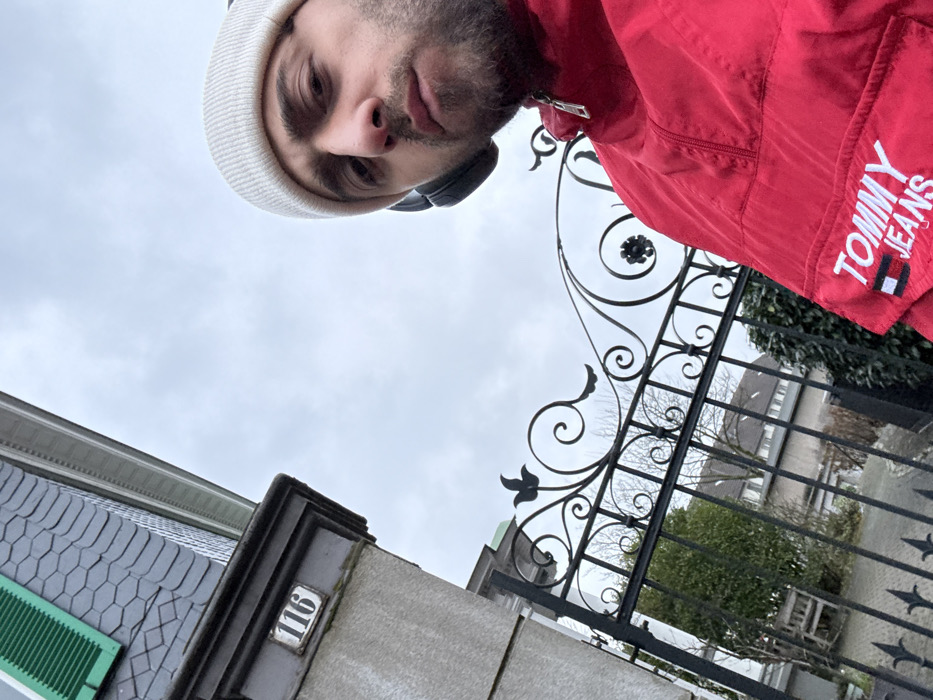 A male individual is depicted in a low-angle self-portrait or photograph taken outdoors in front of Hohenbirken 116, Remscheid, Germany, under an overcast sky