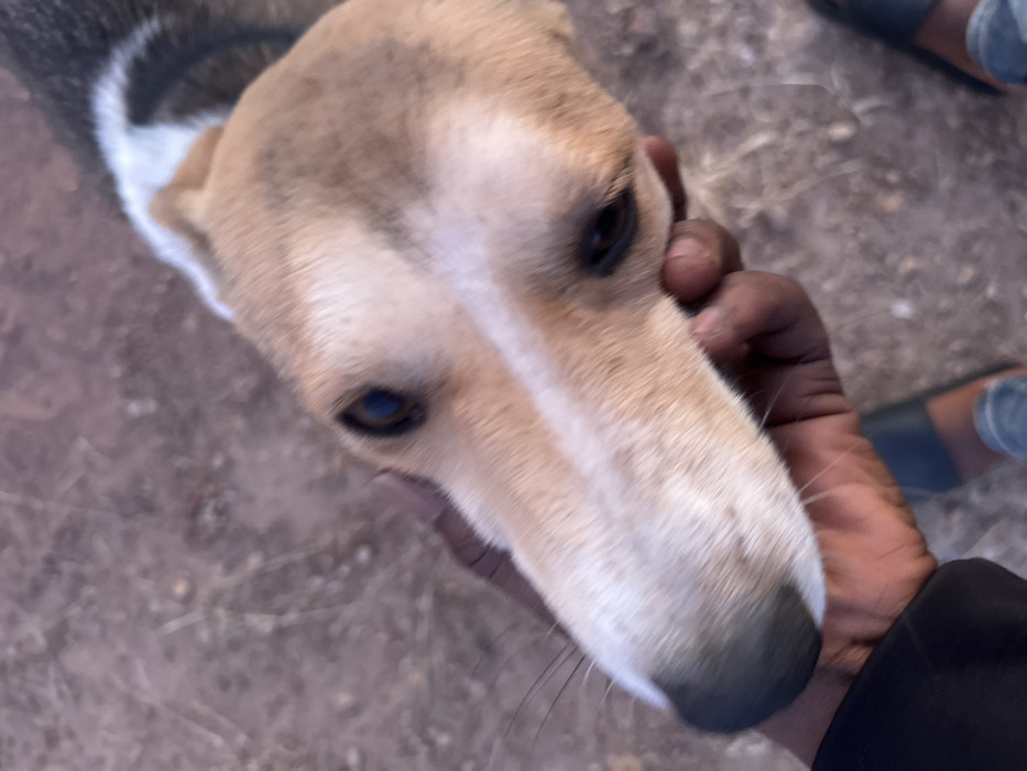 A tan and white dog with a long snout and dark eyes is nuzzling into a dark-skinned person's hand. The person wears a black sleeve. The dog's fur is smooth. The ground appears to be dusty and uneven. Part of another person's foot wearing a blue denim and a blue sandal are in the frame.