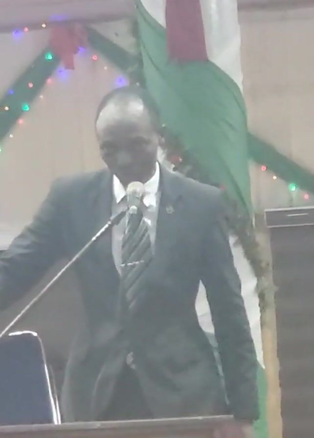A man is speaking at a podium. He is wearing a suit and tie and speaking into a microphone. The background is decorated with a green and white fabric, with a red ribbon at the top. There are strings of lights in the background as well.