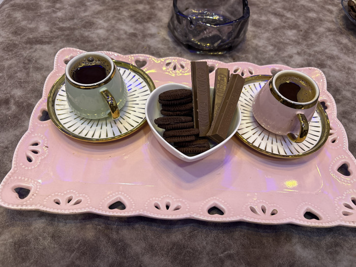 An overhead shot captured in Barza Municipality, Syria, displays an arrangement of coffee and sweets on a textured, mottled dark grey surface