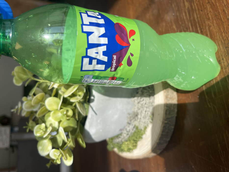 - "A green plastic Fanta Tropical bottle, approximately three-quarters full of bright green liquid, is positioned on a dark brown, polished surface" by FM-ScxXs2, licensed under CC BY 4.0