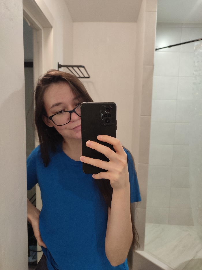 A young woman with long brown hair and glasses takes a selfie in a bathroom mirror. She wears a bright blue t-shirt. A black smartphone obscures part of her face. Behind her, a white wall features a black towel rack. To the right, a shower area with white tiled walls and a glass partition is visible. The lighting in the bathroom appears bright.