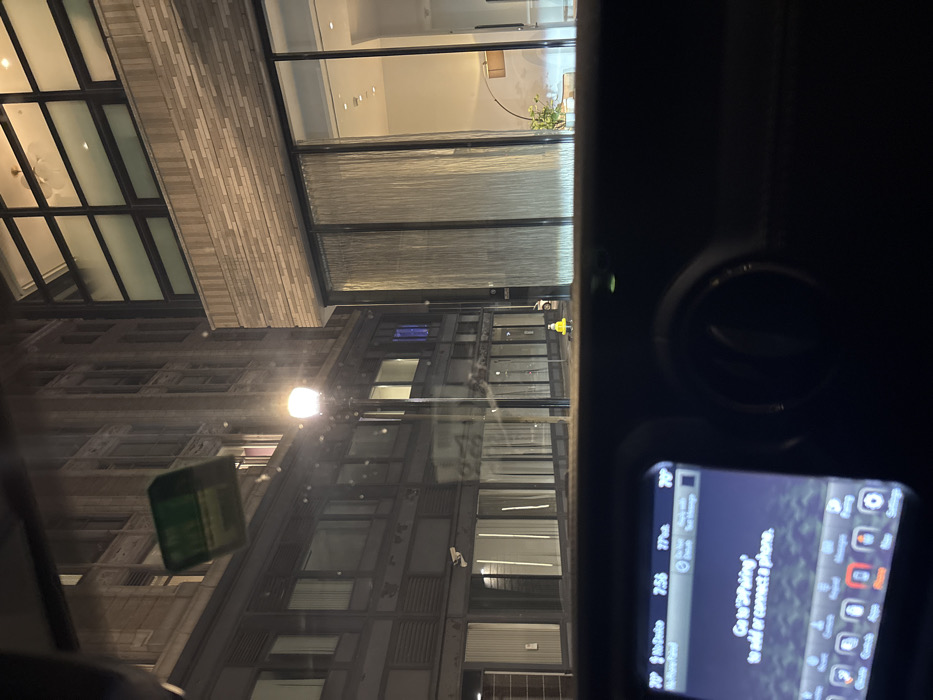 The image depicts a nighttime urban scene in Boston, Massachusetts, United States, viewed from the interior of a stationary vehicle. In the foreground, the dark dashboard of a car is visible, with a central infotainment screen illuminated. The screen displays "Go to 'Uconnect' Pairing to add or connect a phone," along with a time of "7:56," and temperature readings of "77°" and "70°". Through the car's windshield, the street and two prominent buildings are visible. A traditional black streetlamp with an illuminated globe stands in the midground, its light casting reflections on the wet or dusty windshield. A yellow traffic cone is present on the street pavement to the right of the lamp. On the left, a tall, multi-story historic building features a dark facade, ornate architectural details, and numerous windows, some of which are illuminated with warm light, and one with a distinct blue light. A small CCTV camera is affixed above a ground-level window. On the right, a modern building rises, characterized by a lower section clad in light-colored, narrow horizontal bricks. Above this brickwork are large, multi-paned windows, some appearing frosted or translucent. The ground floor of this building features expansive, clear glass windows revealing a brightly lit, minimalist interior with sheer vertical curtains, a large arched floor lamp, and a potted plant. The specific location is Avery Street, with the view looking towards the intersection with Washington Street. The older building on the left is consistent with structures like 677 Washington Street, while the modern building on the right is the W Boston Hotel. The street appears devoid of pedestrians or other vehicles.