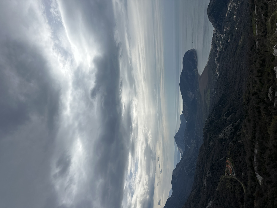 - "An elevated panoramic photograph depicts a mountainous coastal landscape in Novoselje, Montenegro, under a heavily overcast sky showing varying shades of grey clouds with lighter areas where sunlight penetrates" by FM-KFMcf2, licensed under CC BY 4.0