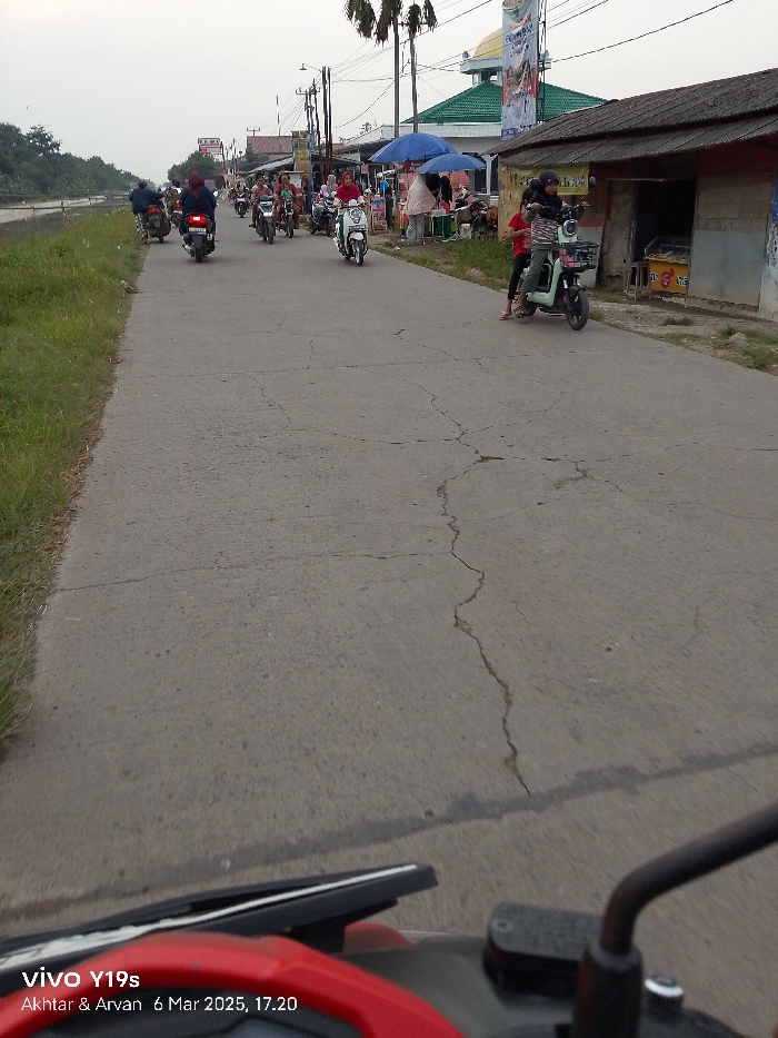 street in Kecamatan Gabuswetan, Indonesia. The street is paved with asphalt, which is cracked. Several people are riding motorcycles, traveling in the same direction. There are buildings on both sides of the street and a few people are standing in the foreground. The image is taken from a motorcycle, with the handle bar and some of the red body of the motorcycle visible in the foreground. The sky is cloudy and the image was taken on March 6, 2023 at 5:20 pm.
