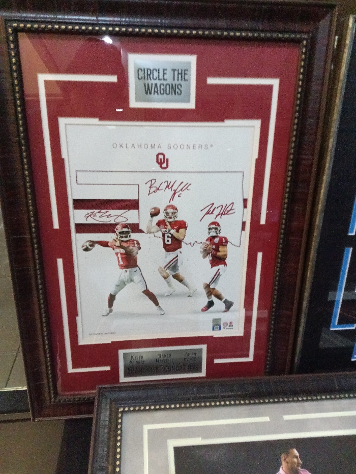 A framed Oklahoma Sooners memorabilia piece features an image of three football players, Kyler Murray, Baker Mayfield, and Jalen Hurts