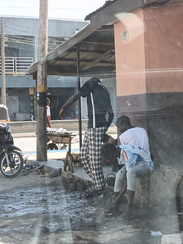 The scene depicts an outdoor urban environment in Dakata, Nigeria, under bright daylight. Three individuals are prominently featured in the mid-ground. On the right, a young male, wearing a light blue and white short-sleeved shirt and light-colored shorts, is seated on a low, irregular concrete block, actively washing his feet in a small, dark basin or directly on the wet ground. Behind him, another male, wearing a white t-shirt, is also seated on the same concrete block, facing generally towards the left. To their left, a tall male stands with his back mostly to the viewer, wearing a black t-shirt with two vertical white stripes on the back and black and white plaid trousers. His left arm is extended downwards and slightly away from his body. In the immediate foreground, the ground surface is extensively wet and appears somewhat muddy or dirty, reflecting the sunlight. Scattered footwear, including several pairs of sandals and slippers, are visible on the dry ground to the left of the wet area. Two dark, handle-equipped kettles or pots are placed on the ground near the standing male's feet. A weathered wooden utility pole, marked with yellow and black spots, stands in the left-center foreground, supporting multiple overhead wires. To the far left, the front wheel and part of a dark-colored motorcycle or scooter are visible. Behind the utility pole and the standing man, a makeshift stall structure with a corrugated metal roof is present. Further back, another stall or market setup includes a wheelbarrow-like cart laden with items. In the background, a multi-story building with light blue/grey walls and white railings is visible on the left. On the right, a two-toned building with an orange/peach upper section and a darker lower section features a circular wall-mounted light fixture. The overall environment suggests a bustling commercial or residential street scene.