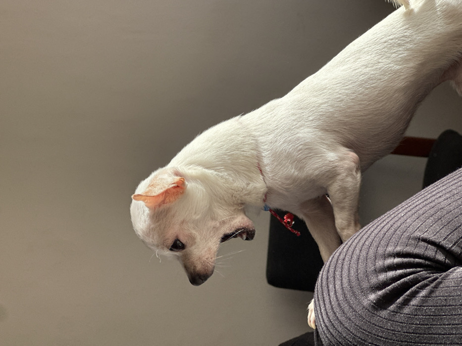 - "The scene depicts a small, white-furred dog standing on its hind legs, with its front paws resting on the upper leg or lap of an individual, whose left leg is partially visible in the lower-left foreground" by FM-GIf9Q2, licensed under CC BY 4.0