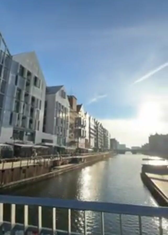 The video opens with a view from a bridge overlooking a canal lined with modern buildings on the left, contrasted by older buildings with traditional architecture on the right
