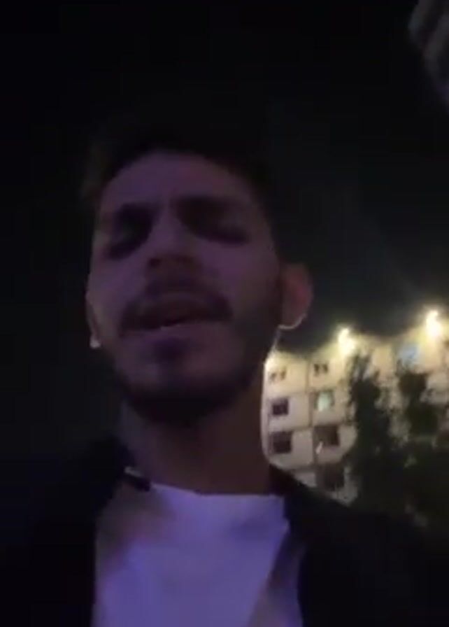 A man with dark hair and a beard is holding a camera and speaking. He is wearing a white t-shirt and a black jacket. He is walking outside at night, with a building visible in the background. The street is illuminated by streetlights.