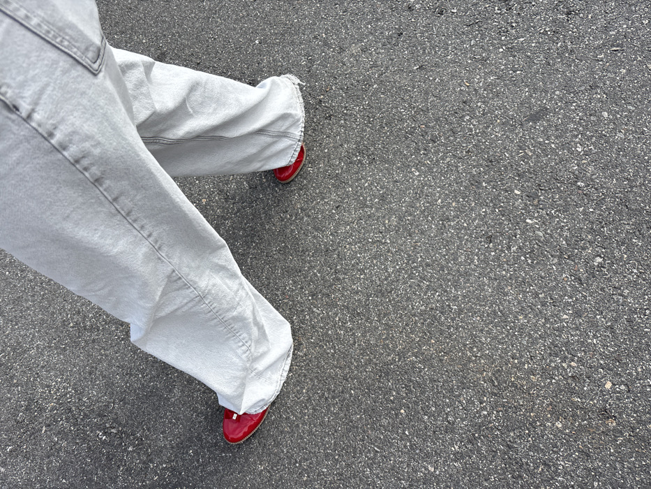 A ground-level forensic view reveals the lower extremities of a person on a dark grey asphalt surface in Wellesley, United States. The individual is wearing light grey, wide-leg denim jeans exhibiting creasing and distinct seam stitching. Bright red, high-gloss flat shoes, possibly loafers or ballet flats, are on their feet, each featuring a white or light-colored decorative element on the upper forefoot. The person's legs are positioned as if in mid-stride or paused during movement, with the viewer's right leg slightly behind the left. The environment is composed of granular asphalt pavement. The scene is illuminated by direct sunlight, casting subtle shadows.