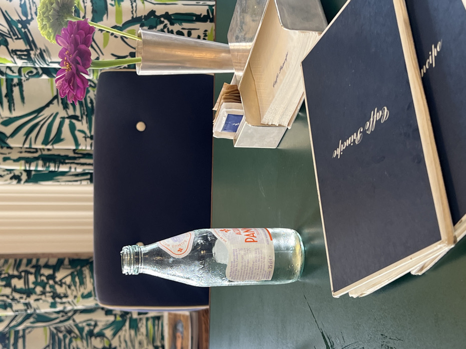 The image presents a close-up view of a table setting inside Caffè Principe in Forte dei Marmi, Italy