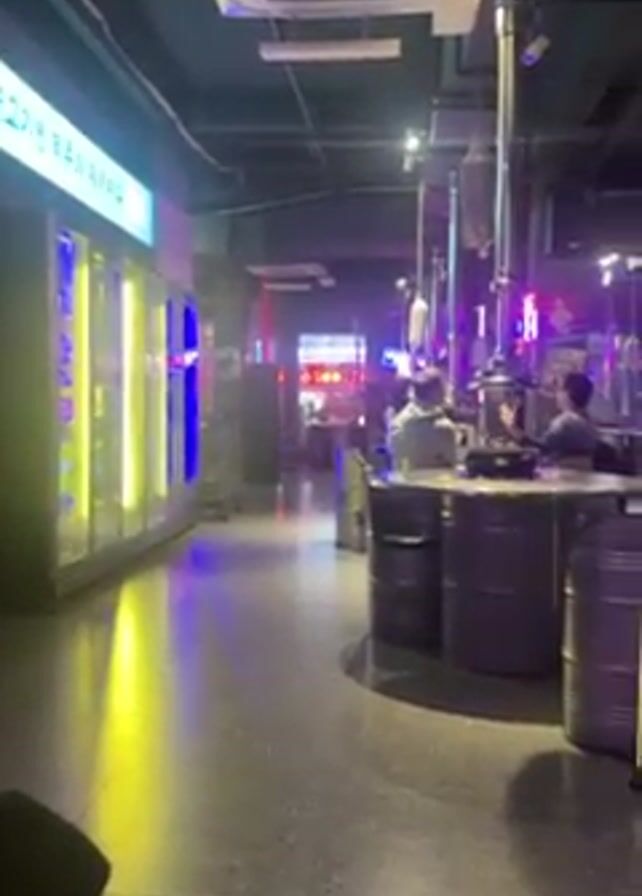 interior of a Korean BBQ restaurant. The floor is grey speckled concrete. Along the left wall is a long row of refrigerated cases, lit with yellow and blue vertical lights. A sign above them is in Korean. Tables are arranged in a row on the right, each with a metal grill and a metal ventilation pipe hanging overhead. The tables are made of dark gray metal barrels. There are people seated at the tables, eating. The back of one person’s head is visible in the lower left corner of the frame. The restaurant has a modern, industrial aesthetic with neon lighting.