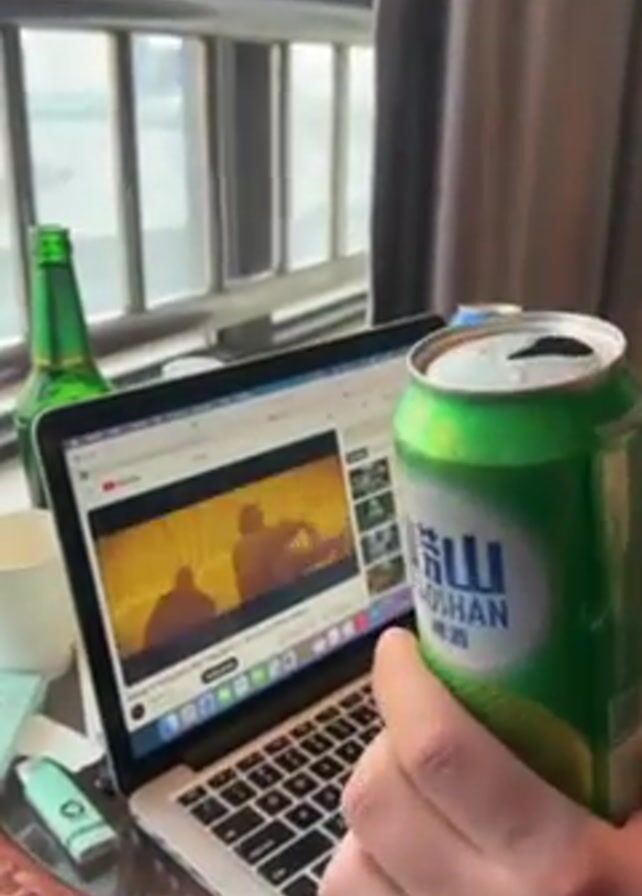 A person holds a green can of soda next to a laptop that is playing a music video on YouTube