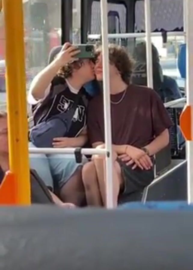 The video depicts two young people kissing on a bus while one of them takes a selfie