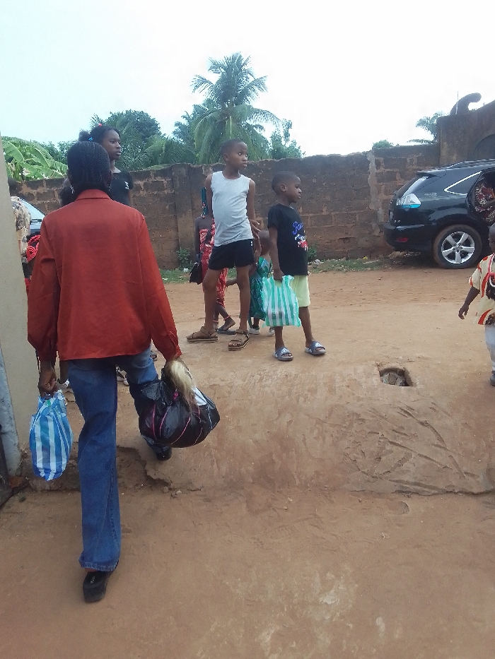 group of people in Ukwu-Abwa, Nigeria, standing on a dirt ground. An adult, wearing an orange shirt and blue jeans, is walking away from the camera while carrying two bags. Several children stand near a low, concrete structure with a hole in it. In the background, there is a brick wall, some trees, and a black SUV.