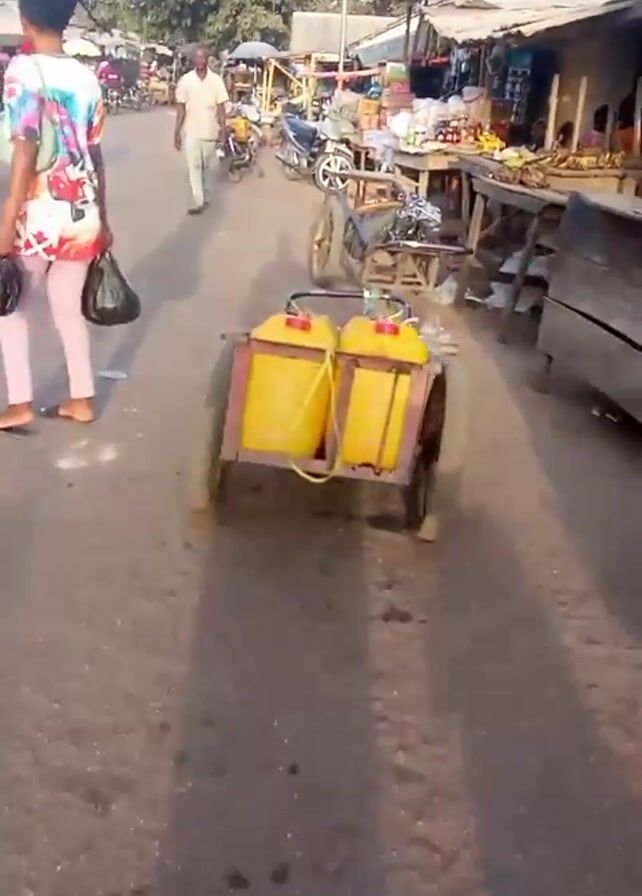 low-angle view of a street scene. A cart with two wheels is being pulled along a paved road. The cart is carrying two yellow jerrycans, then as the video continues, more jerrycans are loaded onto the cart. Shops are lined along the side of the road, with various goods displayed. People are walking on the street, and motorcycles are parked nearby. The general environment appears to be a market or commercial area.