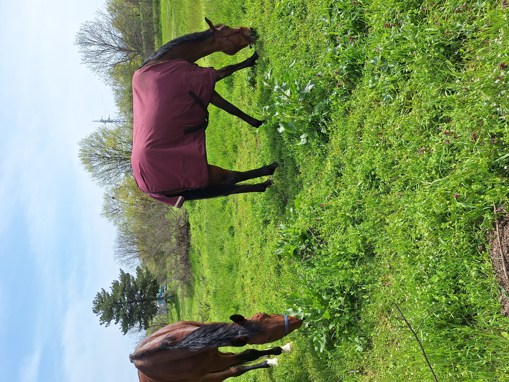 Two brown horses are in a grassy field. One horse is wearing a burgundy-colored blanket. Both horses are eating grass. The scene is located outdoors in a field. Trees and a blue sky are visible in the background. The location within the city of Ruse, Bulgaria, cannot be determined from the image.