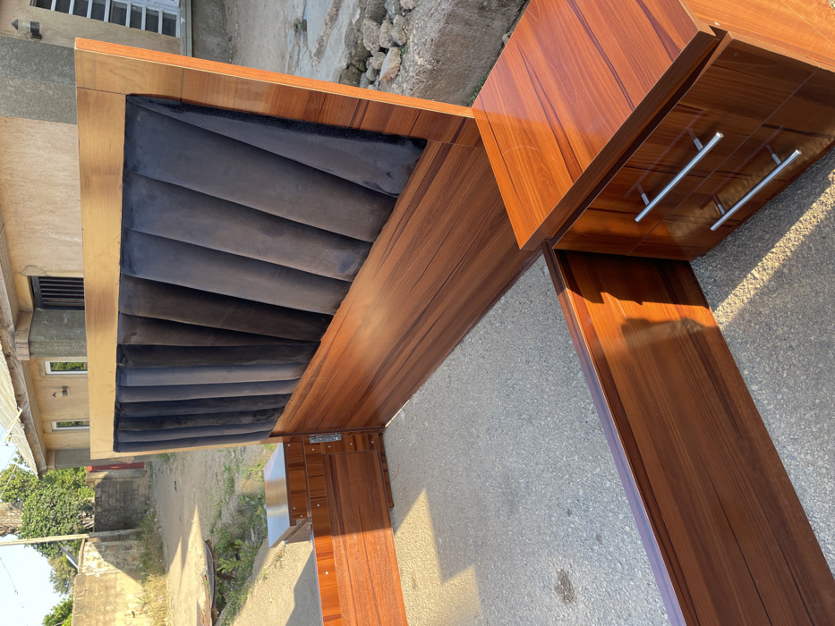 - "The image displays a partially assembled wooden bed frame and integrated nightstands situated outdoors on a grey asphalt or concrete surface in a residential area of Jos, Nigeria" by FM-KFrzk2, licensed under CC BY 4.0
