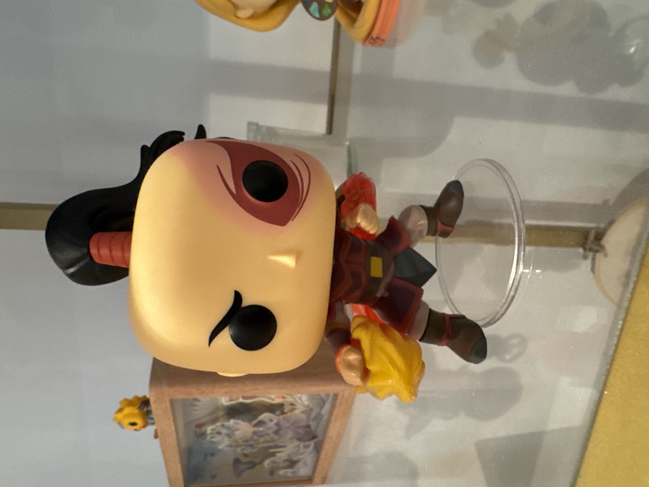 The image displays an indoor scene featuring a collection of figures on a clear glass shelf