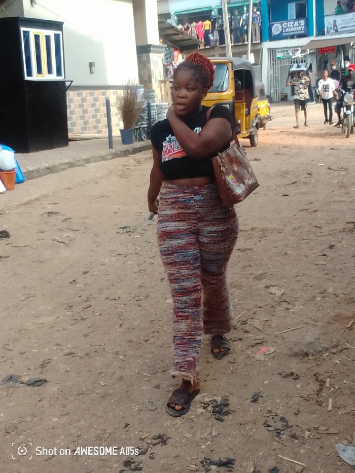 The scene is a daytime street in Egbagu, Nigeria. An adult female, of African descent, is captured mid-stride, walking left-to-right across an unpaved, dirty ground. She wears her reddish, braided hair in an updo, a black short-sleeved crop top with a multi-colored graphic, multi-patterned textured wide-leg pants, and dark open-toe sandals. A brown shoulder bag with a floral or abstract pattern is slung over her right shoulder. Her right arm is raised, hand near her neck, and her mouth is slightly open. The background shows a bustling urban environment. To the left, a black and white structure with yellow-framed windows and a blue bucket is visible. Centrally, a yellow motor tricycle (keke Napep) is parked or moving. Beyond this, multiple commercial buildings line the street, including one with a prominent blue sign for "CIZA'S LAUNDRY" and another displaying clothing on mannequins. Several pedestrians are visible in the mid-ground and background, including a man in a patterned shirt, a woman in a white shirt with "99" printed on it, and another individual on a motorcycle to the far right. The ground throughout the visible street is dirt, littered with minor debris.