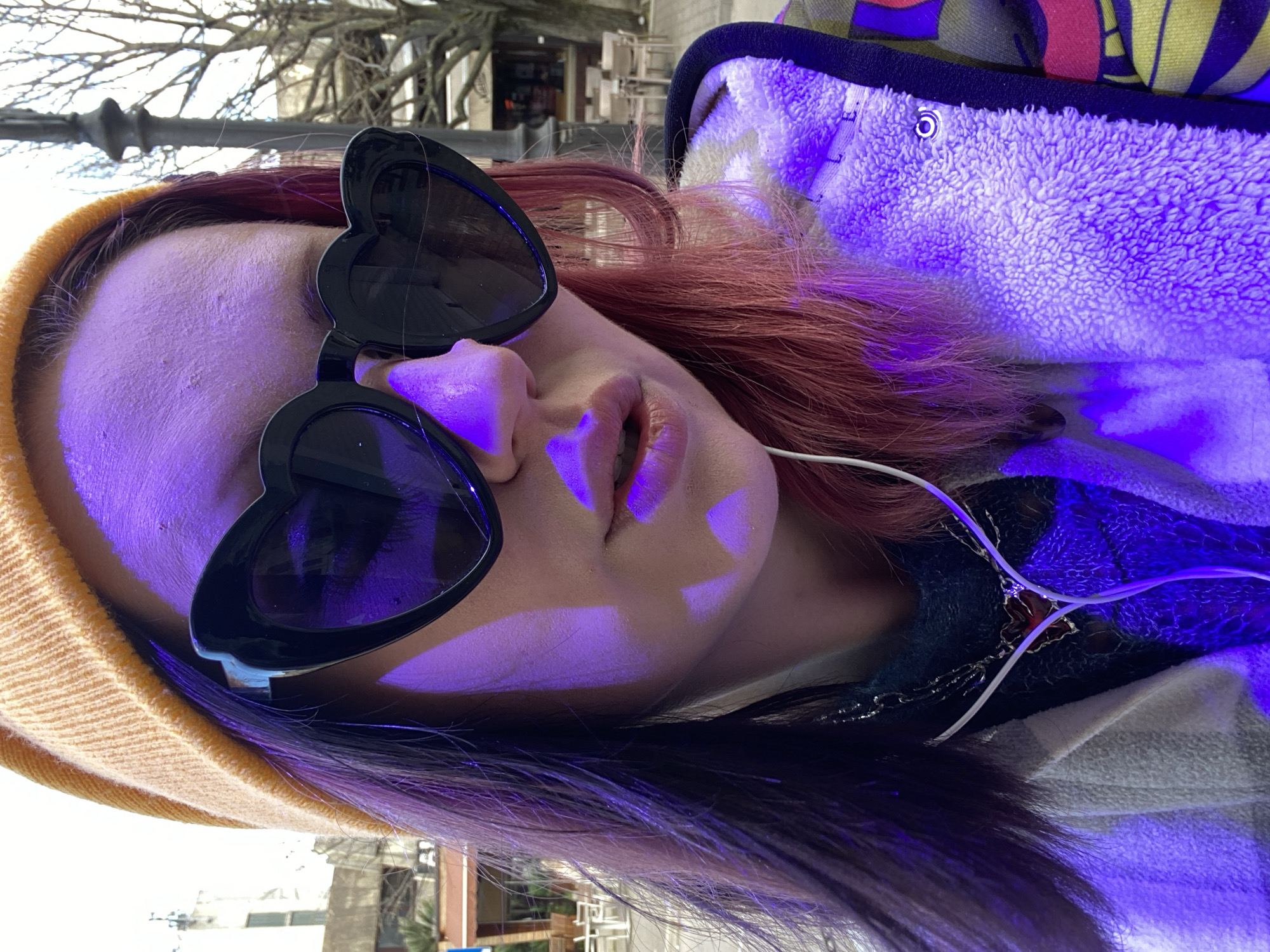 A person with a tan beanie and heart-shaped black sunglasses is wearing white headphones. The person has pink hair and is wearing a cream-colored fuzzy jacket with a dark lining. The image is illuminated by a blue light. The person appears to be outside, possibly in a city, as evidenced by glimpses of buildings and trees in the background. The location in the city of Bar, Montenegro, cannot be determined from the image.