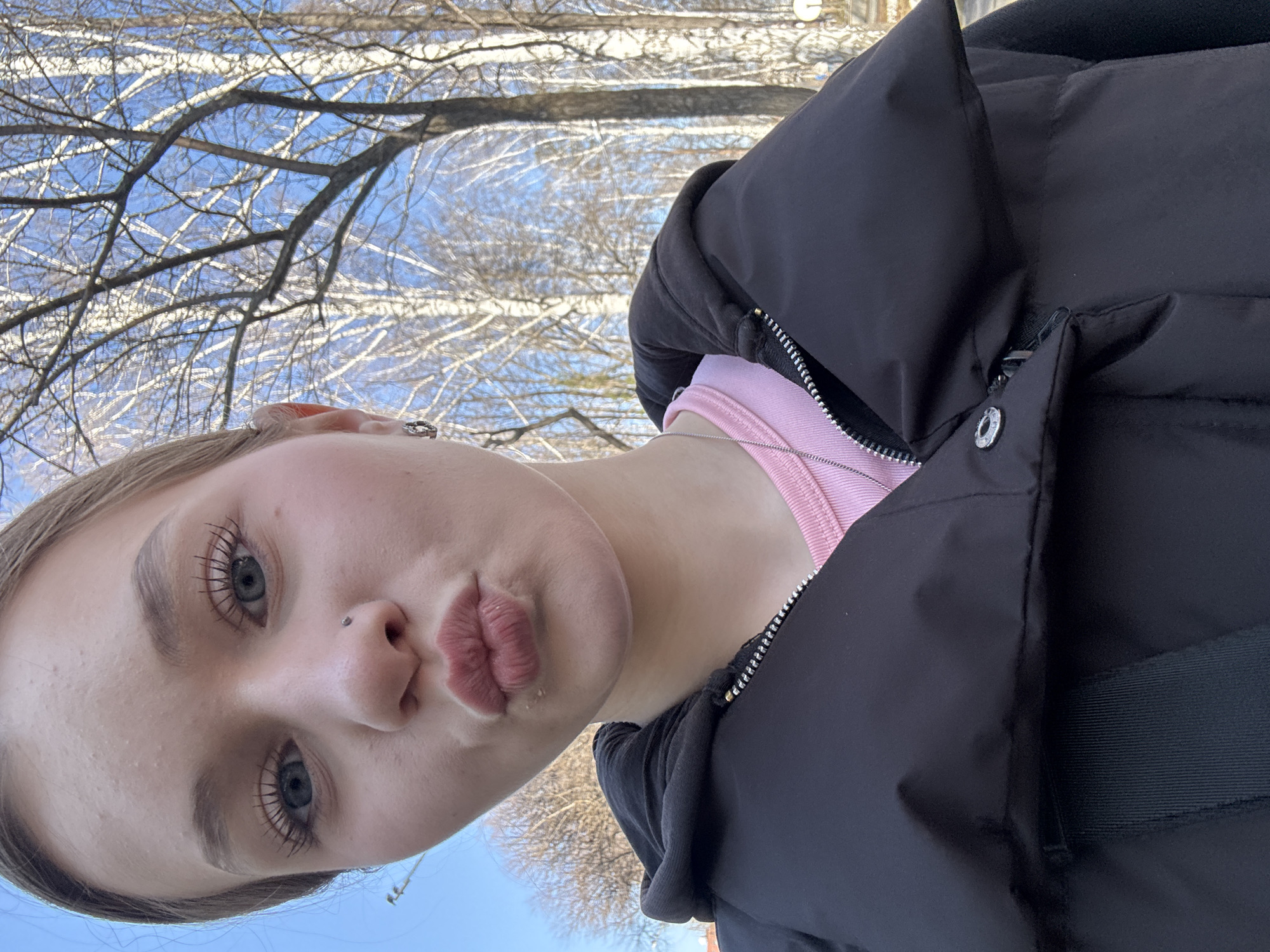 A young woman is shown from a low angle, presumably taken as a selfie. She has fair skin, light hair, blue eyes, and is wearing a pink shirt and a black puffer jacket. She has a nose piercing and is making a kissing face. The background shows bare tree branches against a blue sky. Given the trees with light-colored bark, and the urban setting with bare trees, the location is possibly a park or green space in a colder climate, although no specific details are visible that would specifically identify the location as Yekaterinburg, Russia.
