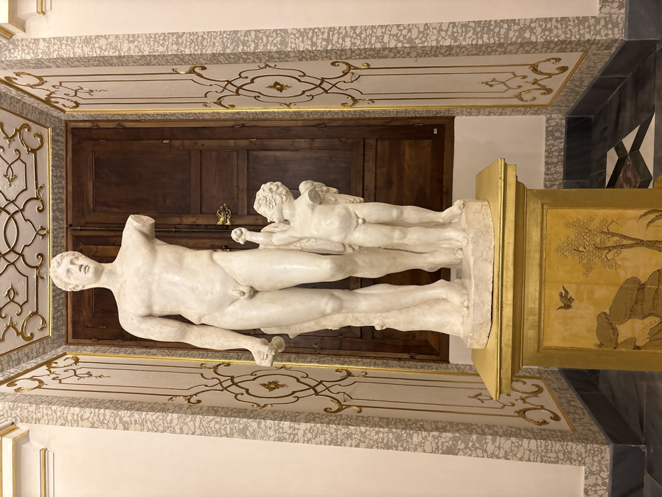 A white marble sculpture featuring two nude figures is centrally displayed on a golden pedestal within an ornately decorated room at Real Sitio de San Ildefonso, Spain. The taller figure, a muscular male, stands upright, missing its right forearm and hand. Its left arm is bent, holding an unidentified object near its hip, and its head is slightly turned, looking upwards. To the right and slightly in front, a smaller, winged nude child figure stands, missing its left forearm and hand. This child's right arm is raised with a clenched fist, and its head is tilted upwards, looking towards the larger figure. Both figures exhibit carved genitalia. The golden pedestal supporting the sculpture features decorative panels with gold and brown depictions of trees, rocks, and a flying bird. The immediate background consists of a dark brown wooden double door with a visible brass doorknob. The surrounding walls are light-colored, adorned with grey patterned sections outlined by vertical golden decorative moldings. The upper wall and ceiling showcase intricate golden scrollwork patterns. The floor is dark, exhibiting a geometric pattern of light and dark tiles.