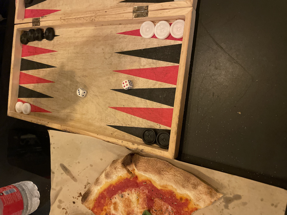 - "The scene, located in Raanana, Israel, displays a tabletop arrangement centered on a backgammon game accompanied by food and drink" by FM-AyUtz1, licensed under CC BY 4.0