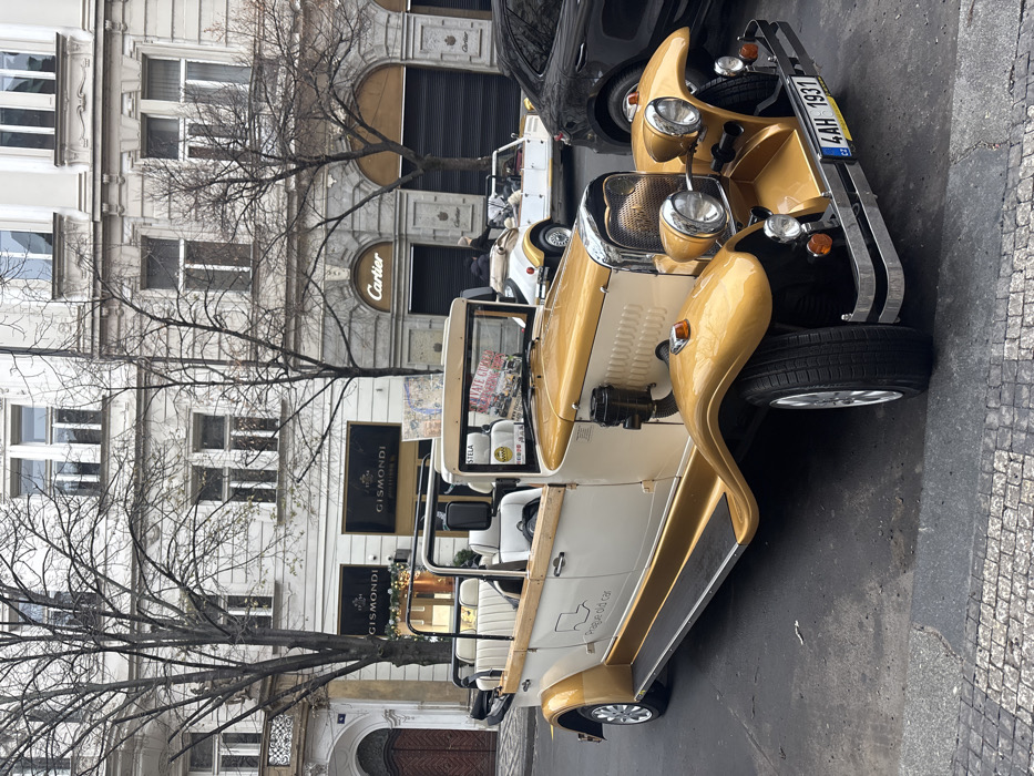 - "An open-top, two-toned cream and metallic gold vintage-style touring car is parked on a cobblestone sidewalk in the Capital City of Prague, Czechia" by FM-2g8Zp2, licensed under CC BY 4.0