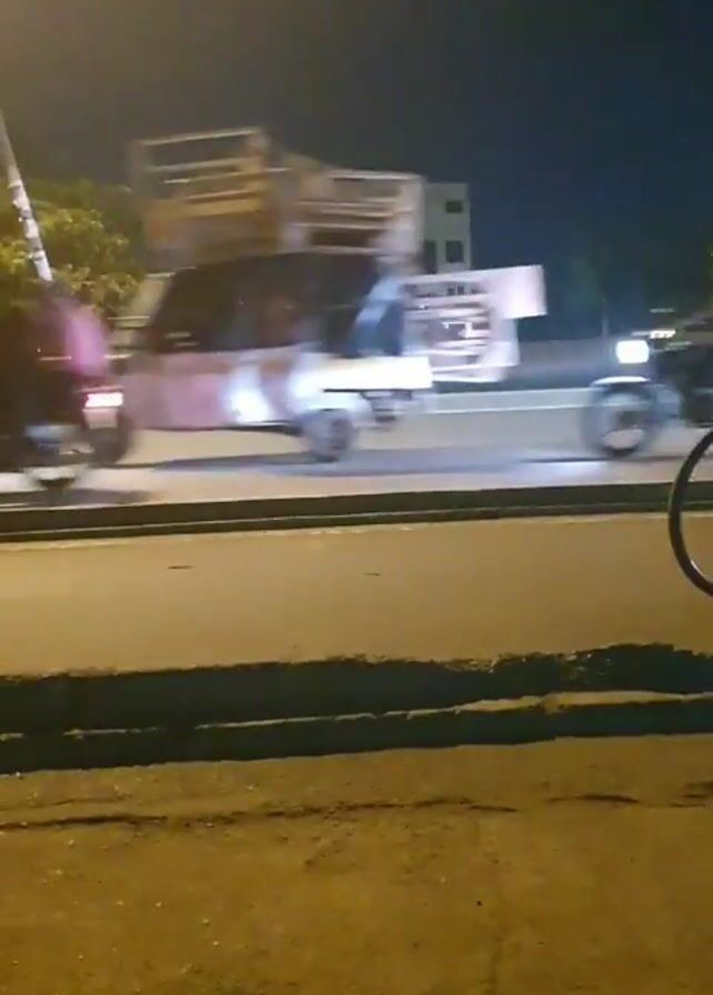 A low-angle view of a street at night captures cars and cyclists speeding by. The camera focuses on the road and the blurred motion of vehicles passing in front of a white building with a distinctive architectural design. Trees are visible in the background. The road surface is lit by streetlights, and the overall scene is dark. The camera remains stationary, capturing the dynamic movement of traffic.