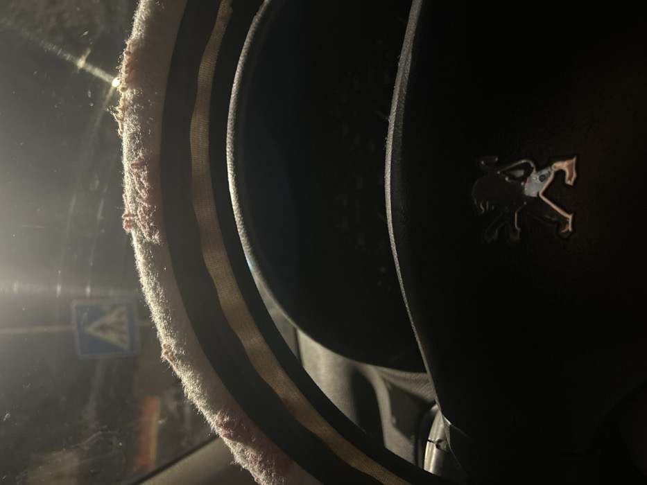 The image presents a forensic view from the interior of a Peugeot vehicle, looking forward through a windshield at night in the city of Yambol, Bulgaria. The central subject is a steering wheel, featuring a black hub emblazoned with a silver-colored Peugeot lion emblem. The steering wheel's rim is fitted with a worn, light-colored fabric cover, likely off-white or beige, exhibiting numerous prominent pinkish-red clumps of pilling and loose fibers, especially along its upper arc. Behind the steering wheel, components of the dashboard and instrument cluster are visible but remain largely indistinct due to low light. The windshield ahead is streaky and reflects multiple bright light sources, indicative of streetlights or other urban illumination. Through the windshield, a clear blue square traffic sign with a white border and a white pedestrian crossing symbol is discernible in the upper left quadrant of the external scene. The environment outside the vehicle is dark, consistent with nighttime conditions in an urban area.
