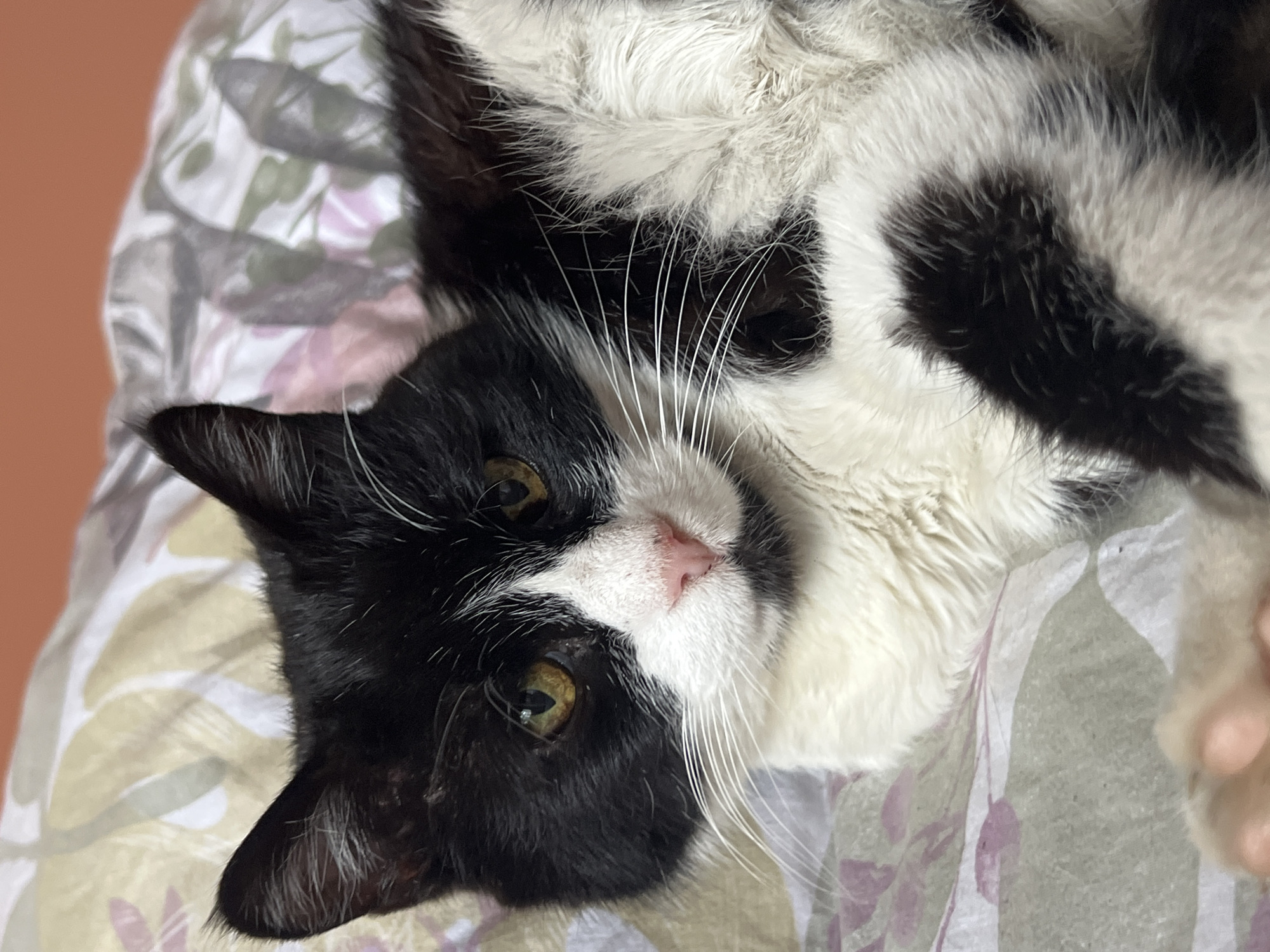 A black and white cat lies on a floral patterned surface