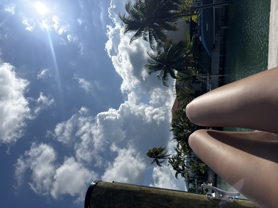 A sunny sky with puffy white clouds is visible behind palm trees. The photo is oriented with the sky at the top left and a body of water at the top right. In the lower right, a person's legs are visible. A wooden pole and metal hardware appear in the bottom center and lower right, suggesting a dock or pier setting.