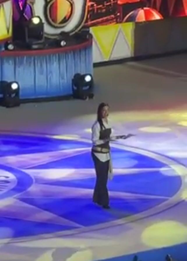 A woman is on stage, apparently giving a speech or presentation. The woman is wearing a white shirt with a brown corset-like top and black pants. She is standing in the center of the stage. The stage has a geometric design in blue and white. Behind her is a colorful backdrop that looks like a circus-themed set. There are spotlight-style lights around the stage. The woman is smiling and gesturing with her hands.
