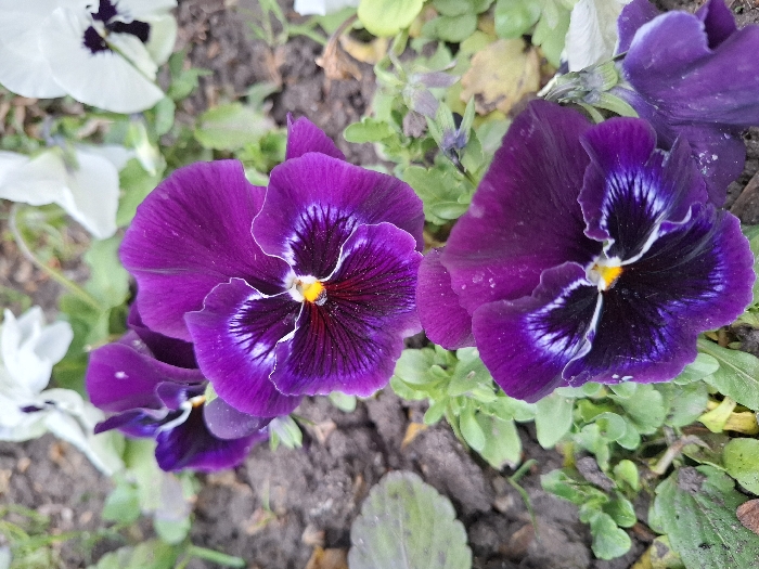 A close-up photograph captures a cluster of pansy flowers planted in a garden bed in Plovdiv, Bulgaria. The foreground features three prominent deep purple pansies, each displaying a central dark purple-black blotch with intricate white and light purple veining radiating outwards, centered on a small yellow anther. The petals exhibit a smooth, velvety texture. The flowers are rooted in dark, moist soil mixed with small brown organic debris and surrounded by small green leaves and foliage. In the blurred background, several white pansies with dark centers are partially visible. No human figures or activities are depicted.