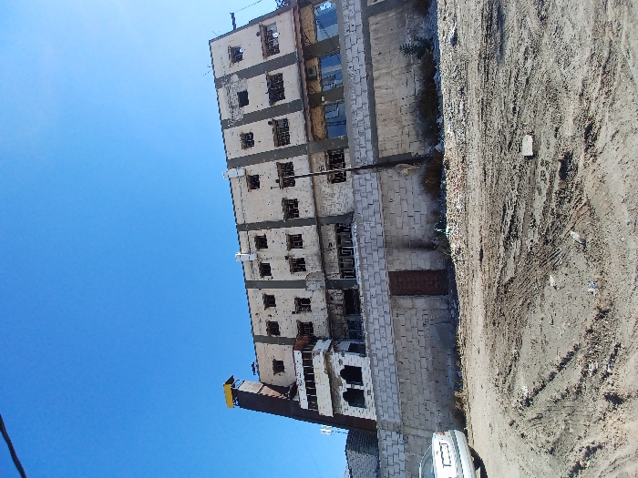 The image depicts a multi-story building located in As-Sabina, Syria, under a clear blue sky. The building, likely of concrete or masonry construction, features a light-colored (beige/off-white) facade with numerous rectangular window openings. Many windows appear empty, damaged, or boarded, and the facade itself shows evidence of damage consistent with bullet holes or shrapnel impacts. Dark vertical strips segment the building's exterior. On the left side of the structure, a tall, dark rectangular shaft, possibly a chimney or ventilation system, rises with a yellow cap. Adjacent to it is a lower section of the building, which is white and features arched window designs. The building's ground level is fronted by a concrete block wall, within which a dark brown door is centrally located. Below the wall, the immediate foreground is an unpaved, uneven dirt area covered with prominent tire tracks and patches of dry mud. Sparse, dry vegetation is visible near the base of the wall. A light-colored (silver/white) sedan is partially visible on the far left, parked on the dirt ground. A dark utility pole stands directly in front of the building, roughly centered. No individuals or specific actions are observed. The environment appears to be in a state of disrepair or neglect.