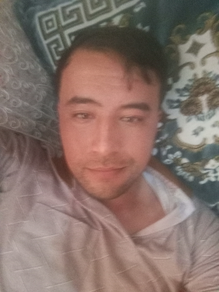 A male individual, appearing to be a young adult with short dark hair and light facial stubble, is depicted in a close-up selfie. He is wearing a light-colored, possibly beige or light grey, long-sleeved garment with a subtle, textured pattern of fine horizontal or diagonal lines. A white collar or undershirt is visible at the neck opening on the right side. The individual has dark eyes and a neutral expression with a slight smile, gazing towards the camera. The background consists of two distinct patterned fabrics: a lighter grey fabric with a swirling, curvilinear design on the left, and a darker teal or blue-green fabric featuring a mix of floral and geometric fret patterns on the right. The scene indicates an indoor setting in the city of Pichakchi, Uzbekistan.