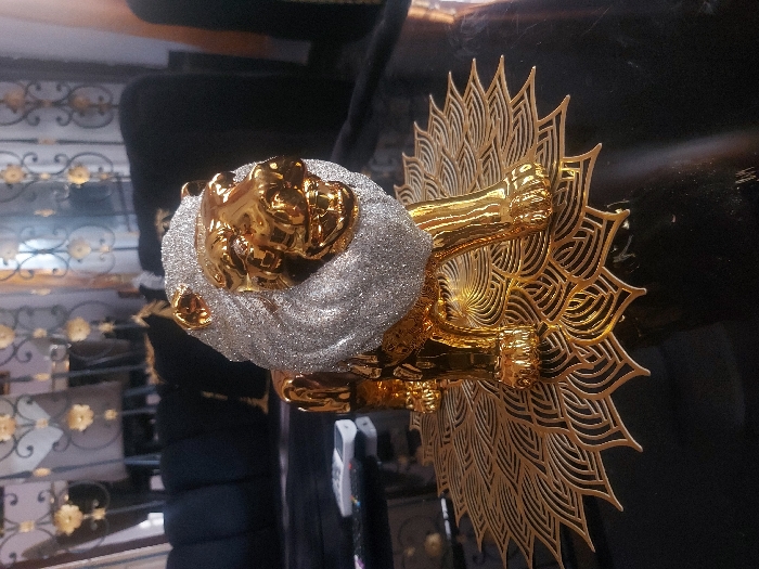 A decorative lion figurine is positioned on a dark, reflective table surface. The lion features a gold-colored, polished body and head, contrasting with a silver glitter-covered mane and upper neck. It stands on a round, gold-toned placemat with a complex, open-work leaf or feather pattern. Two remote controls, one white and one black, are visible on the table to the left of the placemat. The background shows blurred elements of an indoor setting, including dark upholstered furniture and a decorative metallic screen or partition with black scrollwork and gold floral accents. The image provides no visual information to determine its location within Alor, Nigeria.