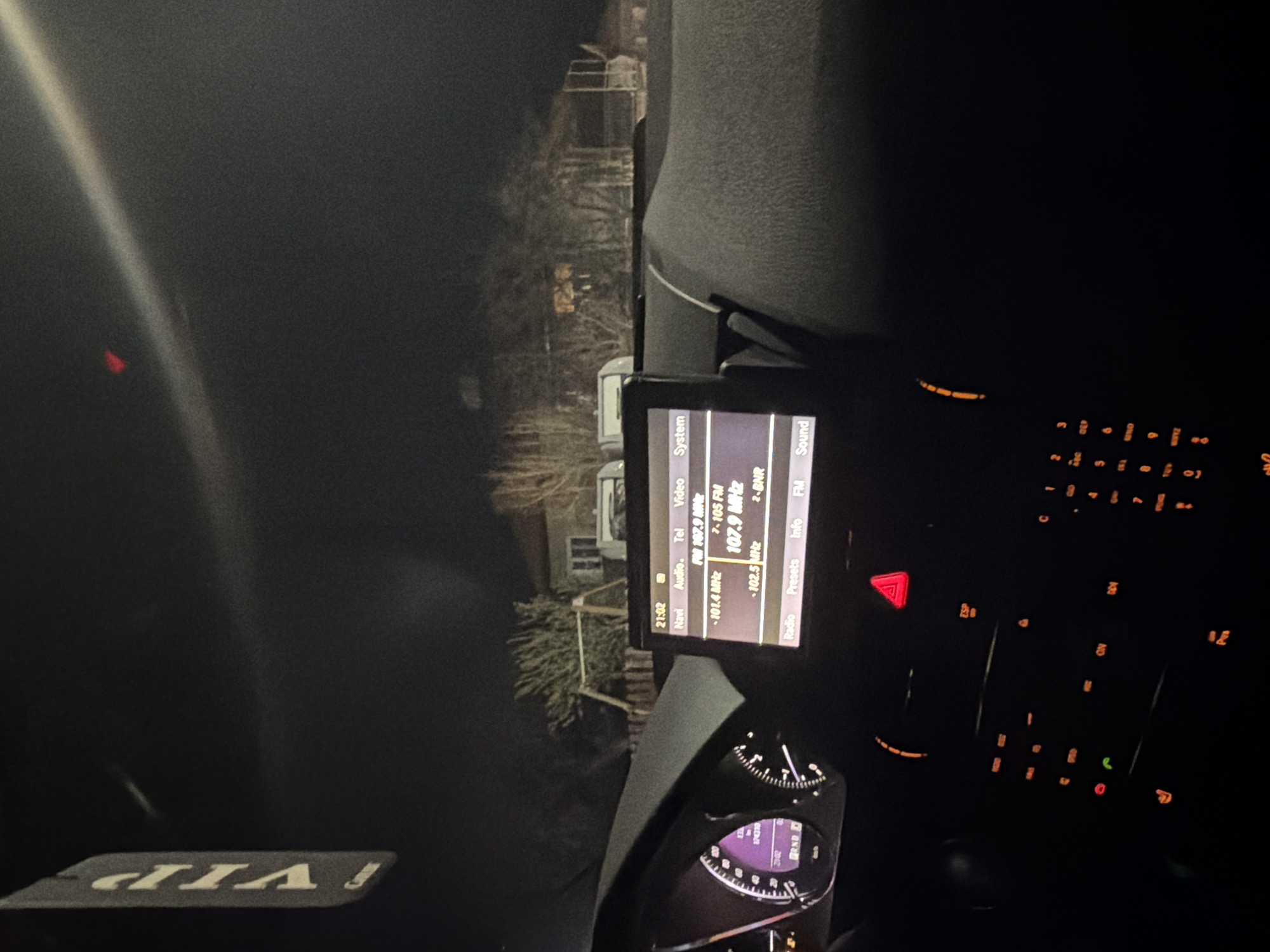 A view from inside a vehicle's interior, likely a car. The dashboard is visible, including the infotainment screen displaying radio frequencies (101.4 MHz, 107.9 MHz, 102.5 MHz). A VIP sign is positioned in the lower left corner. Outside the vehicle, a building with windows is visible, suggesting a residential or commercial area. Trees with bare branches indicate either a cold or off-season. Overall dark environment indicating the image was taken at night. Based on the GPS information, the location is Dragichevo, Bulgaria.