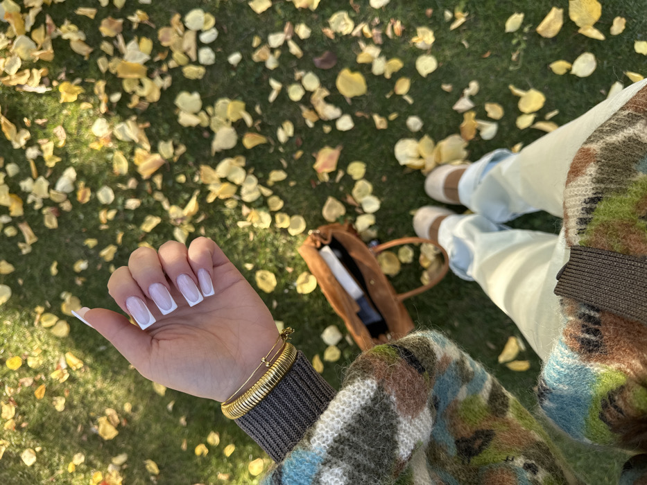 A top-down, first-person perspective captures a person's lower body and extended left hand in a park or grassy area within the city of Yerevan, Armenia, during autumn. The ground is covered by green grass interspersed with numerous scattered yellow and light brown fallen leaves, illuminated by direct sunlight. The prominent left hand displays square French-tip manicured nails and wears a stack of gold-toned bracelets, including a ridged bangle and two delicate chain bracelets. The arm is covered by a patterned knit sweater in dark grey, brown, light blue, and olive green. The person's lower half is dressed in light-colored, cuffed trousers and beige closed-toe shoes with straps across the instep. A brown suede handbag, open and revealing contents, rests on the grass near the feet.
