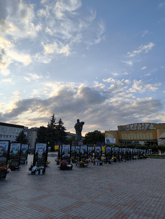 A public square features a statue and rows of portraits. Each portrait has floral arrangements at its base. A building with "Kino" visible in Cyrillic script is in the background. The sky is filled with scattered clouds, suggesting either sunrise or sunset. There are buildings and trees visible around the square. The portraits appear to be memorials, creating a somber atmosphere.