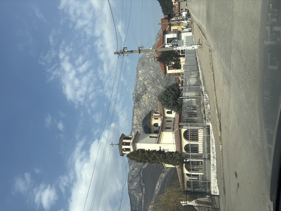 The image presents a daytime street scene in Zgorigrad, Bulgaria. A light yellow Orthodox church with a red-tiled roof occupies the central-left, featuring a multi-tiered bell tower topped with a dark, octagonal roof and a cross. Behind the tower, a large, dark dome is visible. The church's lower section includes an arched portico, and the grounds are enclosed by a grey metal fence. A tall, slender evergreen tree stands adjacent to the bell tower, with smaller trees present within the church compound. A white sign displaying black Cyrillic text, reading "Къща Захари Стоянов Музей-Галерия" (House of Zahari Stoyanov Museum-Gallery), is affixed to the fence. A paved asphalt road curves gently uphill and to the right in the foreground and midground. A concrete sidewalk borders the church property and extends along the right side of the road. Several two-story residential-style buildings with light-colored facades and red-tiled roofs line the right side of the street. A utility pole supporting multiple overhead power lines is situated on the right side of the road, and additional power lines traverse the upper part of the frame. The background is dominated by large, grey, rocky mountains with some sparse vegetation. The sky is blue with scattered white cumulus clouds. No individuals are visible. The perspective suggests the photograph was taken from inside a vehicle, evidenced by a reflection on the lower edge of the frame.