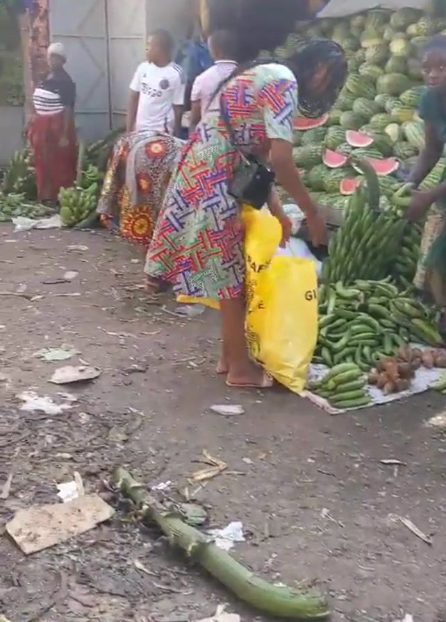 bustling outdoor marketplace. Numerous people are present, many of whom appear to be vendors or customers. One woman is sorting through green bananas, while another is packing them into a yellow bag. In the background, there's a large pile of watermelons, some sliced open. The ground is uneven, covered with dirt, scattered leaves, and plant debris. In the distance, a red auto-rickshaw is parked under a red umbrella. A variety of clothing, including dresses and patterned wraps, are visible on the people.