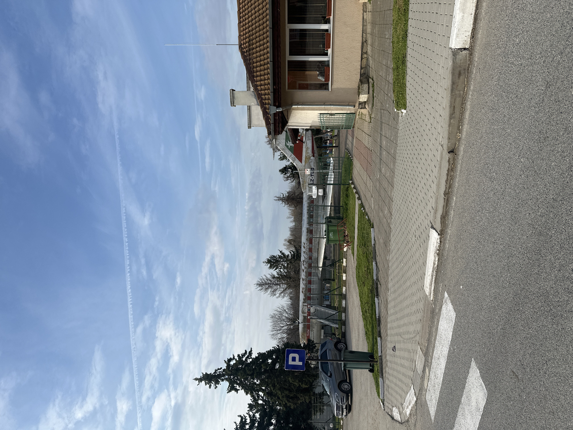 The scene is set outdoors in Pordim, Bulgaria, under a partially cloudy blue sky featuring prominent contrails. In the immediate foreground, a grey asphalt road with a white-striped pedestrian crossing occupies the lower left. This road borders a grey tiled sidewalk and paved area, separated by a concrete curb. On the left, a grey Mercedes-Benz SUV is parked on a paved lot adjacent to a blue square parking sign marked with a white "P". A dark green trash bin is positioned near the sign. Behind the parked vehicle, a tall, dark green coniferous tree stands. The midground features a large, retired Tupolev Tu-134 aircraft, marked "Tu 134" on its fuselage and "LZ-TLD" towards the tail section. The aircraft is painted white with red and green striped accents, and a set of stairs provides access to its open passenger door. It is situated on a grassy area behind a green metal fence. Another green trash bin is visible near the aircraft. To the right of the aircraft, a single-story building with a brown tiled roof and light beige walls is present. It features multiple windows with brown window boxes and a prominent chimney. A tall, thin antenna extends vertically from the roofline on the far right. A partially open green metal gate provides access to the area behind the building and towards the aircraft. The background consists of a treeline composed of both evergreen and bare deciduous trees. No individuals are visible in the depicted scene.