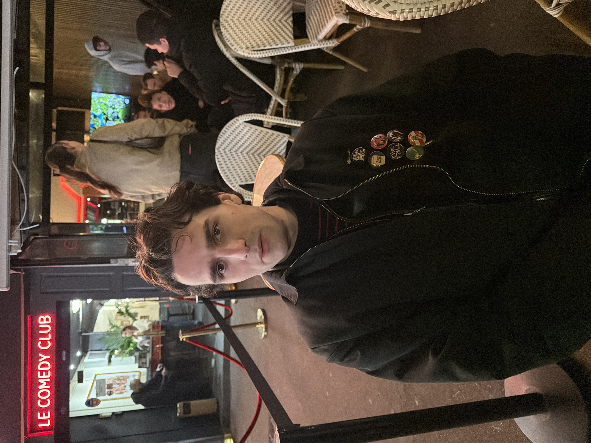 The image depicts an evening scene on an urban street in Paris, France, outside a venue identified by a red neon sign as "LE COMEDY CLUB." In the foreground, a young adult male with dark, wavy hair and a neutral expression looks directly at the camera. He wears a dark, collared jacket over a striped undershirt, with the jacket's zipper partially open. On his left lapel, several round pin badges are affixed, prominently featuring text such as "Sonic Youth," "The Fall," and "The Jesus and Mary Chain." He appears to be seated at an outdoor table, though only a portion of an empty round table and white woven chair are visible to his right. To the immediate left and slightly behind the main subject, the entrance to "LE COMEDY CLUB" is visible. The entrance is demarcated by black stanchions with red velvet ropes. Inside, a well-lit interior reveals a bar or counter area where one individual in a dark coat is seated, and another person in a light-colored top stands behind it. Potted plants and a framed artwork are also visible within the club's entrance. To the right and further behind the main subject, an outdoor seating area with multiple white woven chairs and small tables is occupied by several individuals. One person with long dark hair in a ponytail, wearing a beige jacket, stands facing away from the camera. Nearby, other individuals are seated at tables, appearing to be in conversation. Further back, a person in a light grey hoodie stands. A television screen displaying abstract green and blue patterns is visible on a wall in the background of this seating area. The ground surface is a dark pavement, and the overall lighting is dim, characteristic of an evening or nighttime setting, with artificial light sources illuminating the club entrance and the outdoor seating.